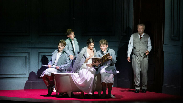 Режиссёр Лидия Штайер в своём зальцбургском спектакле добавляет в повествование фигуру дедушки, который читает «Волшебную флейту» трём своим внукам, как сказку перед сном.
