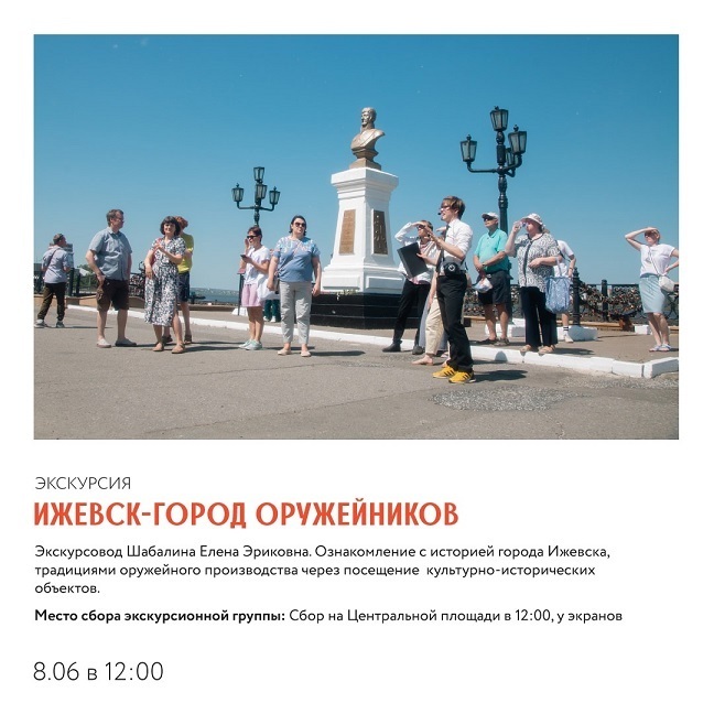 – 12:00 — «Ижевск — город оружейников», экскурсовод Елена Шабалина, член Союза журналистов Удмуртии;