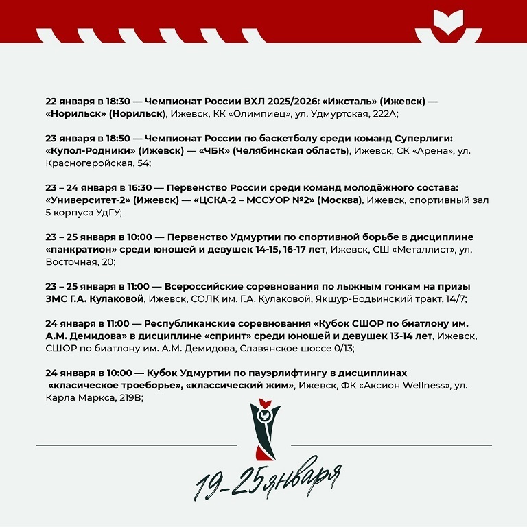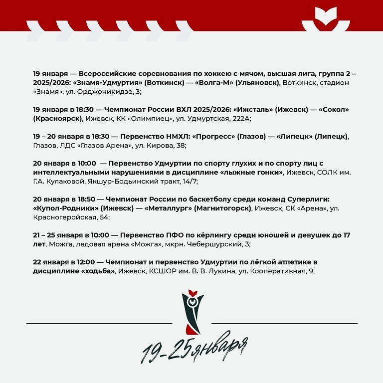 Среди них — соревнования по хоккею, баскетболу, кёрлингу, лёгкой атлетике, борьбе, пулевой стрельбе и другим видам спорта.