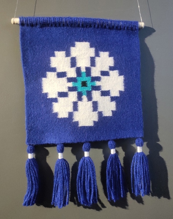 На выставке она представила много интересных и необычных работ, в том числе, оберег от сглаза, сделанный из шерсти, акрила, полипропилена и клёна в 2021 году.