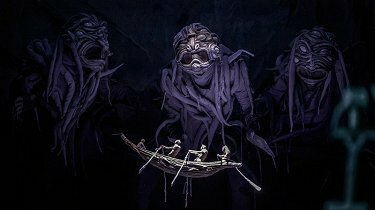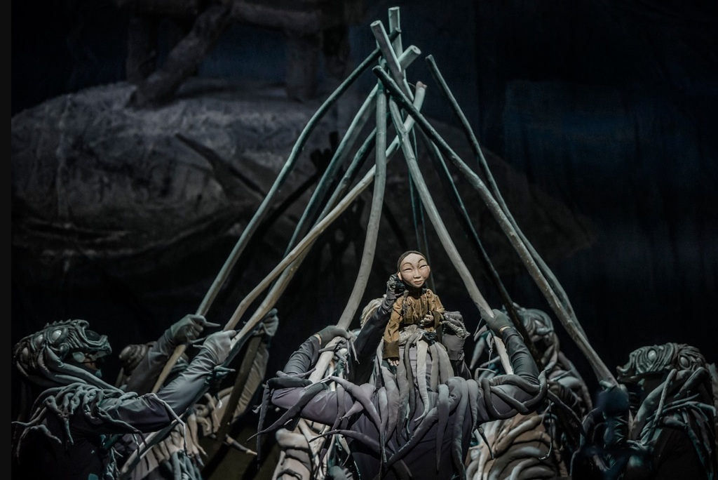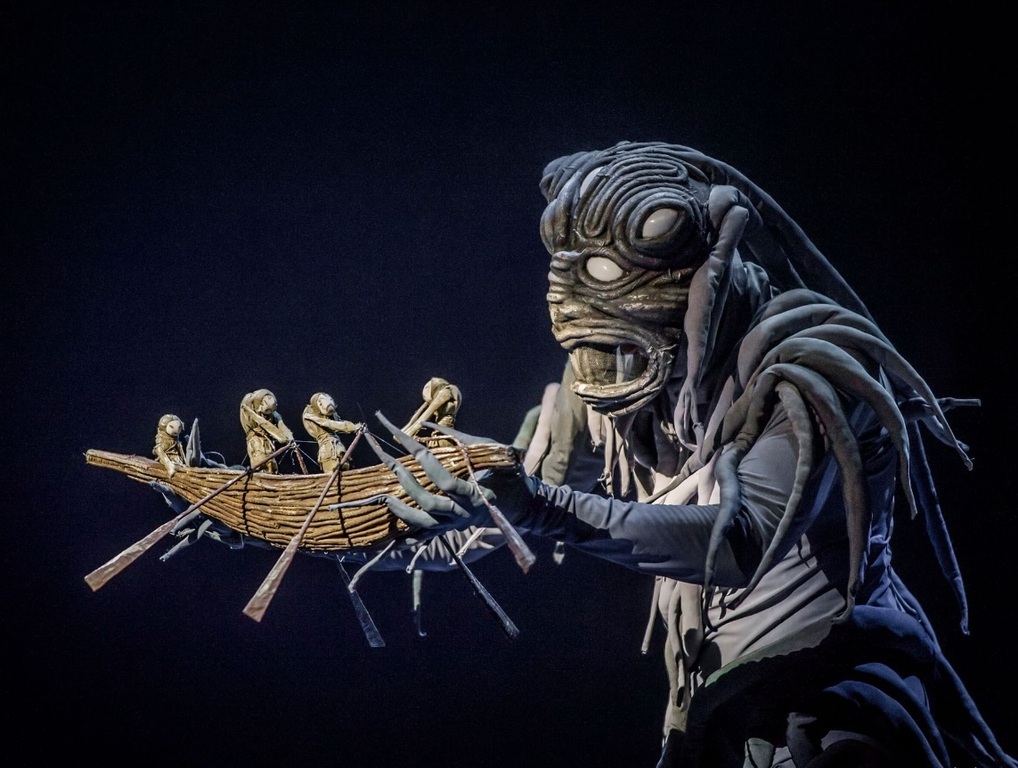 Спектакль отличается потрясающей сценографией, особенно впечатляет картина шторма, бушующего в море: маленькая лодка с несколькими куколками — совсем маленькими по сравнению с огромным пространством сцены и большими духами-актёрами — мечется по волнам-рукам, вокруг туман, вспышки молний-софитов, обрывки ткани, повсюду шёпоты, звуки и удары шаманского бубна. Всё это так завораживает, что поневоле начинаешь переживать за этих куколок-людей: выживут ли они? Или свалятся в море, так и не доплыв до берега? А может быть их утащит на дно женщина-рыба, или она — их единственное спасение? Или сцена, где одинокая лодка с единственным оставшимся человеком на борту крутится вокруг своей оси, не имеющая возможности плыть дальше, удерживаемая духами воды. На неё зритель смотрит как бы сверху — очень кинематографичный приём. И ты спрашиваешь себя: почему же герой соберётся с силами, не возьмёт весло, чтобы грести? Сколько маяться ему одному, оставшемуся на милость стихии — и духов?