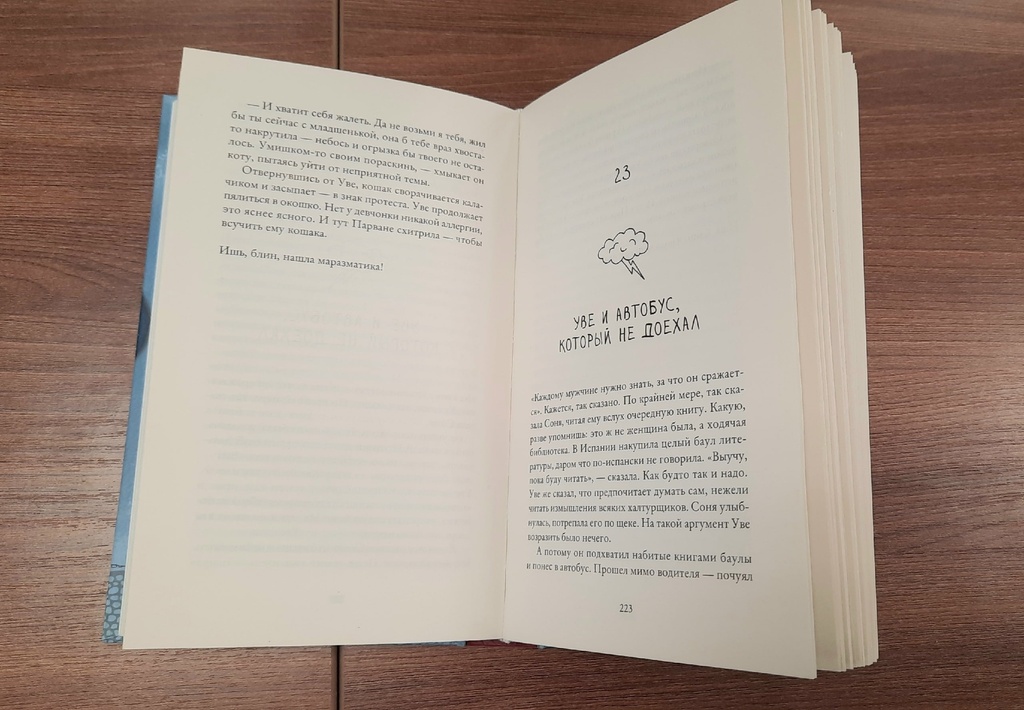 «И вот наступил понедельник, но Сони уже не было.Уве и сам точно не знал, отчего превратился в сурового молчуна. Оттого ли, что стал больше беседовать сам с собой. Или же мало-помалу выживал из ума. Сам нет-нет и задумывался об этом. Выходило так, что не подпускает он к себе людей из страха, как бы память о дорогом её голосе не потонула в гомоне их сварливых голосов».