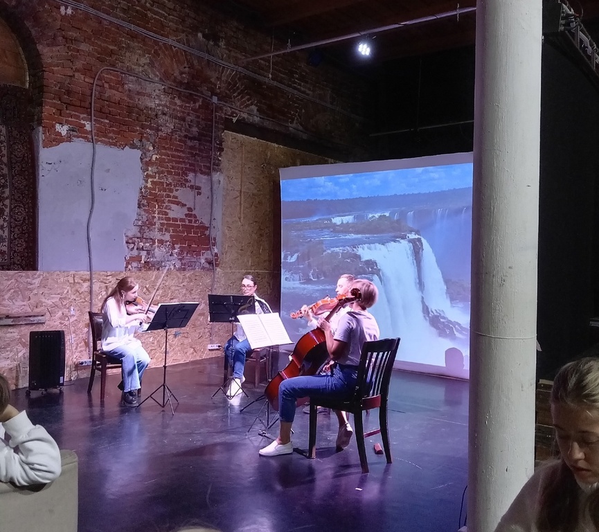 Камерность концерту обеспечило место, в котором он проходил — зал ЦСДР в парке Горького. Небольшой зрительный зал, маленькая сцена, подушки, пледы, диванчики и горячий чай добавили уюта и словно перенесли в прошлое, когда в большом доме какого-нибудь дворянина или генерала собирались гости, чтобы пообщаться, отметить какое-то событие, потанцевать и послушать музыку. Не было этой зачастую давящей, напыщенной атмосферы филармонии или большого стадиона, куда приходят высокопоставленные люди, где слова «концерт классической музыки» звучат особенно горделиво и непристуно.