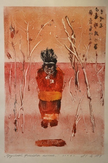 Все картины в экспозиции выполнены в технике «монотипия» — когда художник сначала наносит изображение на металлическую пластину, а затем переносит на влажную бумагу.